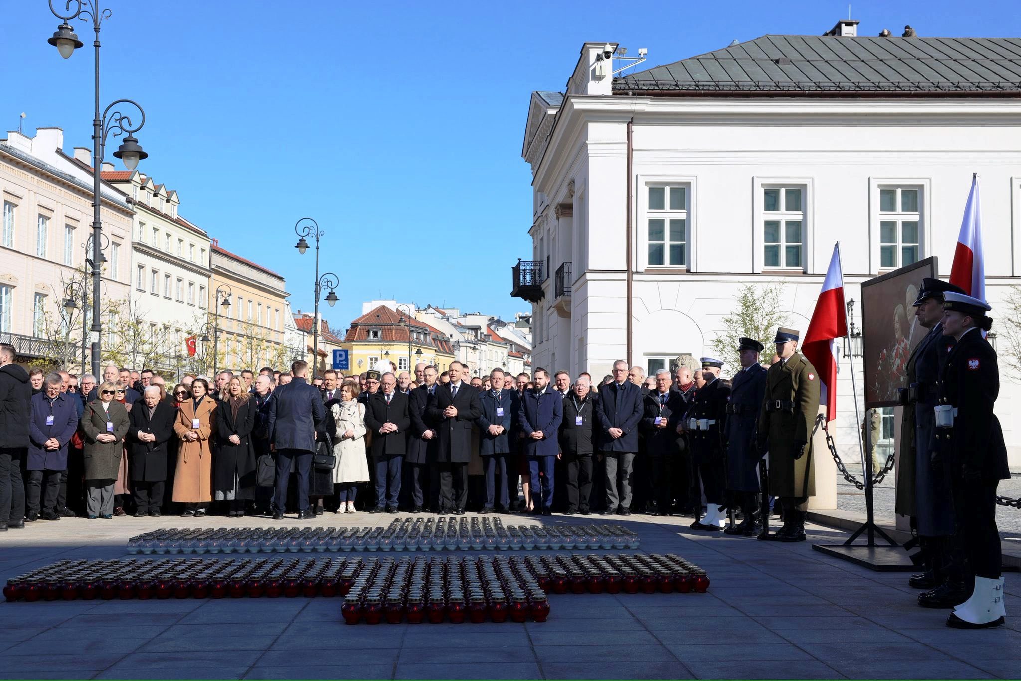 Warszawa. W XVI rocznicę Katastrofy Smoleńskiej Prezes PiS Jarosław Kaczyński, Prezydent RP Karol Nawrocki oraz Przedstawiciele Prawa i Sprawiedliwości oddali hołd i złożyli kwiaty przed Pałacem Prezydenckim, pod Pomnikiem upamiętniającym Śp. Prezydenta RP Lecha Kaczyńskiego oraz pod Pomnikiem Ofiar Tragedii Smoleńskiej 2010 roku. #Pamiętamy 🕯️ /fb/
