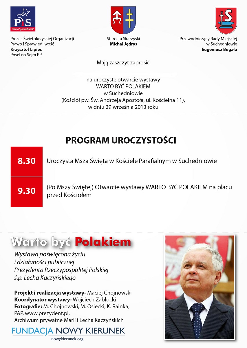 odbył się wernisaż wystawy poświęconej życiu i działalności publicznej śp. Prezydenta RP Lecha Kaczyńskiego "Warto być Polakiem". Wernisaż ten zainicjował prezes świętokrzyskiego Prawa i Sprawiedliwości poseł Krzysztof Lipiec wraz ze starostą skarżyskim Michałem Jędrysem i przewodniczącym Rady Miejskiej Eugeniuszem Bugałą. W uroczystości tej uczestniczyła pani poseł Maria Zuba. Andrzej Pruś sekretarz świętokrzyskiego PiS odczytał okolicznościowy list premiera Jarosława Kaczyńskiego prezesa Prawa i Sprawiedliwości. W uroczystości wziął udział Andrzej Wilkosz członek prezydium świętokrzyskiego PiS. Wcześniej ks. Marek Migocki, proboszcz miejscowej parafii odprawił Mszę Świętą w intencji śp. Prezydenta RP Lecha Kaczyńskiego, Jego małżonki Marii i wszystkich, którzy zginęli w tragedii smoleńskiej.