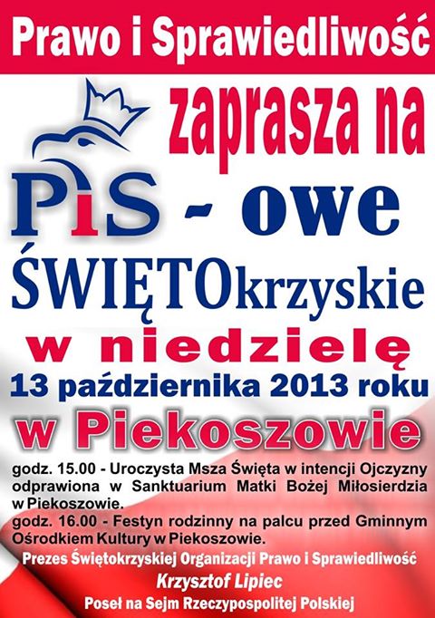 Piekoszów. W Dniu Papieskim, w niedzielę 13 października Świętokrzyska Organizacja Prawo i Sprawiedliwość obchodziła swoje doroczne święto – PiS-owe ŚWIĘTOkrzyskie. W tym roku członkowie oraz sympatycy Prawa i Sprawiedliwości z województwa świętokrzyskiego spotkali się w Piekoszowie. Po uroczystej Mszy Świętej w intencji Ojczyzny, która odprawiona została w piekoszowskim Sanktuarium Matki Bożej Miłosierdzia z udziałem wielu mieszkańców Piekoszowa oraz członków i sympatyków Prawa i Sprawiedliwości, druga część uroczystości odbyła się przed Gminnym Ośrodkiem Kultury na festynie rodzinnym. Otwierając PiS-owe ŚWIĘTOkrzyskie, Prezes Prawa i Sprawiedliwości w regionie, Poseł na Sejm RP Krzysztof Lipiec zaapelował do wszystkich organizacji politycznych i społecznych o jedność w działaniach na rzecz województwa i jego mieszkańców ogłaszając „