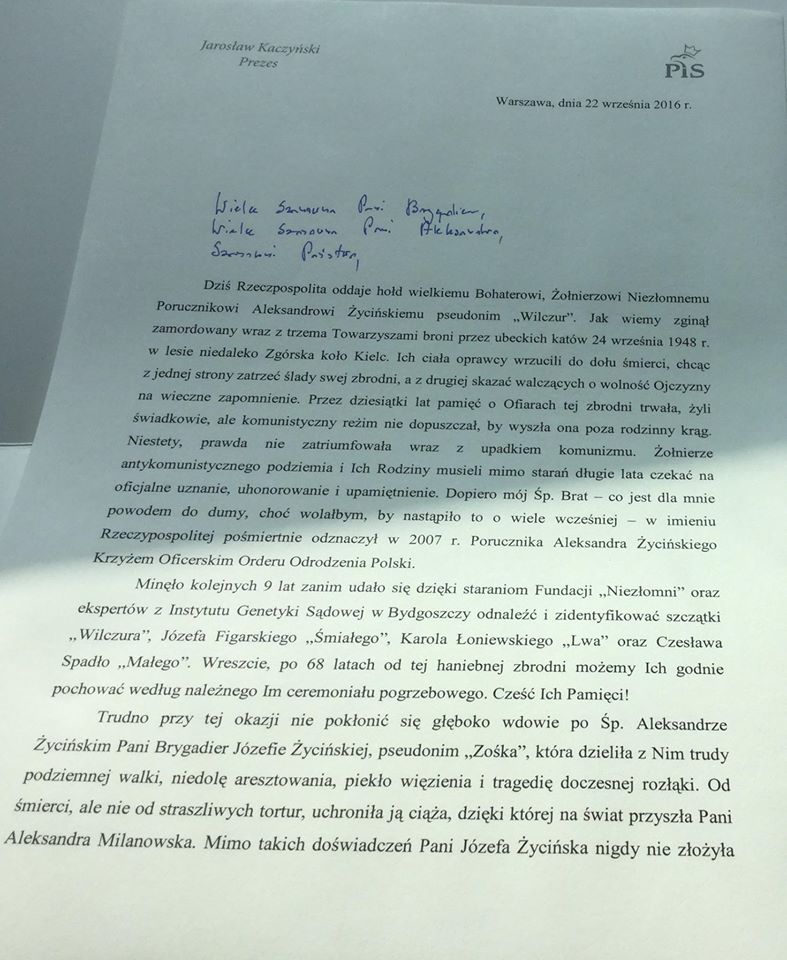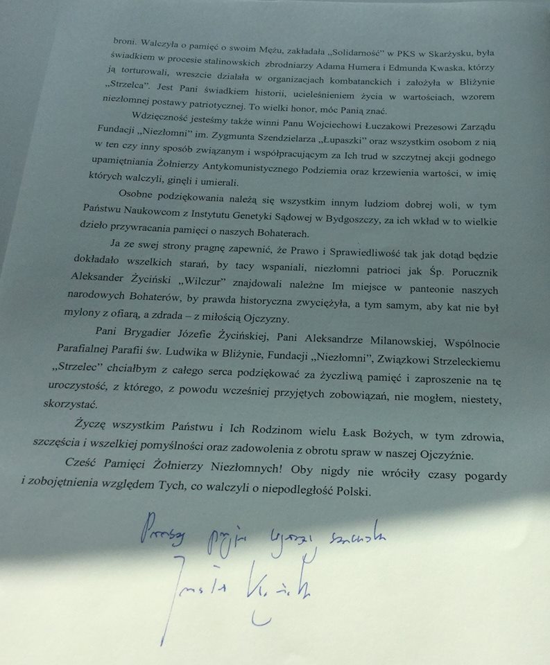 Bliżyn. Uroczystości pogrzebowe por. Aleksandra Życińskiego ps. Wilczur. Żołnierza Niezłomnego zamordowanego przez komunistyczne służby bezpieczeństwa. Jego doczesne szczątki poszukiwane przez 68 lat, odnaleziono w lesie, tam gdzie oprawcy wrzucili ciało.Miałem przyjemność odczytać list Prezesa Prawa i Sprawiedliwości Pana Jarosława Kaczyńskiego. /fb/