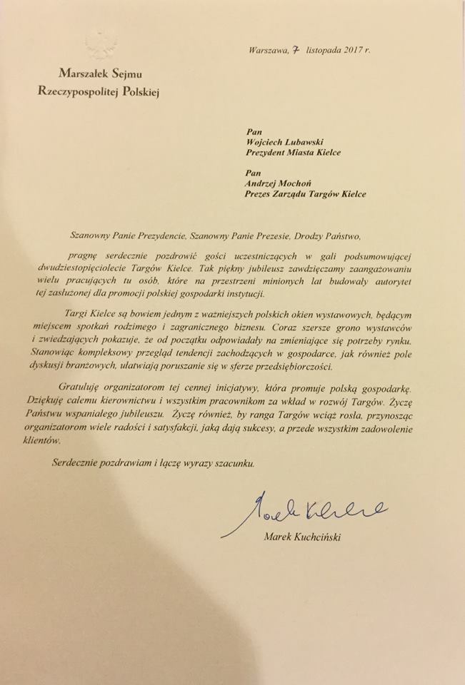 Warszawa. W Teatrze Polskim podczas gali jubileuszowej 25-lecia Targów Kielce miałem zaszczyt reprezentować Marszałka Sejmu RP Marka Kuchcińskiego, który napisał do szacownych Jubilatów okolicznościowy list. /fb/ foto. Jarosław Kubalski /Radio Kielce