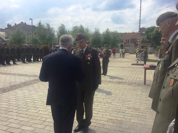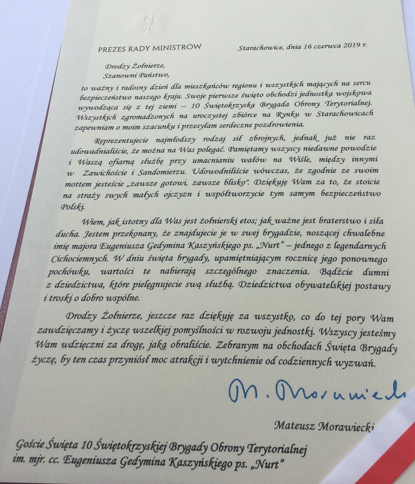 Starachowice. Święto 10. Świętokrzyskiej Brygady Obrony Terytorialnej im. cichociemnego Eugeniusza Gedymina Kaszyńskiego ps. Nurt. Miałem zaszczyt reprezentować Prezesa Rady Ministrów Mateusza Morawieckiego, który skierował do Żołnierzy list okolicznościowy. List ten po odczytaniu przekazałem na ręce dowódcy Brygady płk Artur Barański. W uroczystościach wziął udział gen. dyw. Wiesław Kukuła dowódca WOT. /fb/