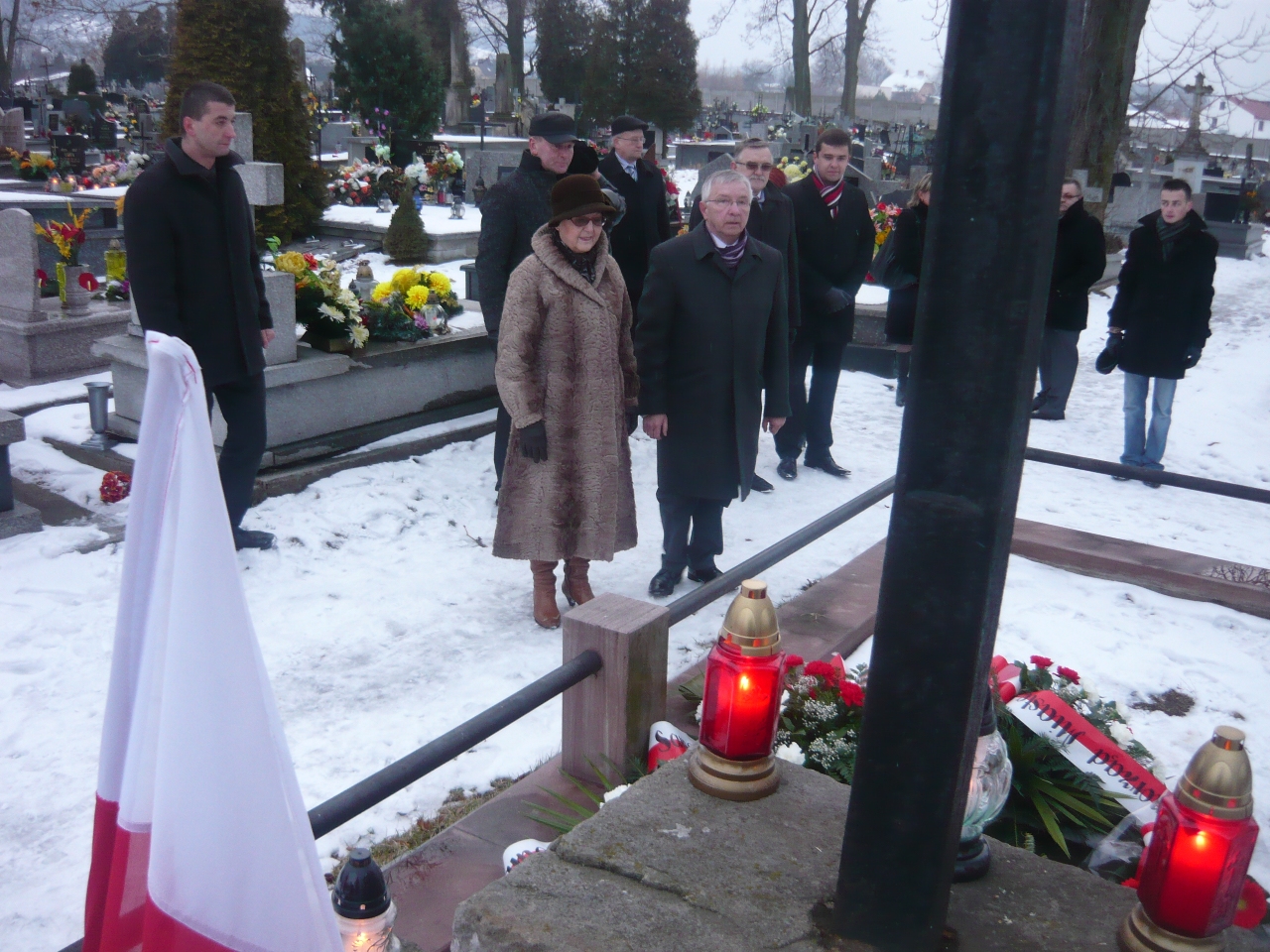 Posłowie na Sejm RP Maria Zuba i Krzysztof Lipiec podczas składania wiązanki kwiatów na mogile powstańców 1863 roku, która znajduje się na cmentarzu w Bodzentynie