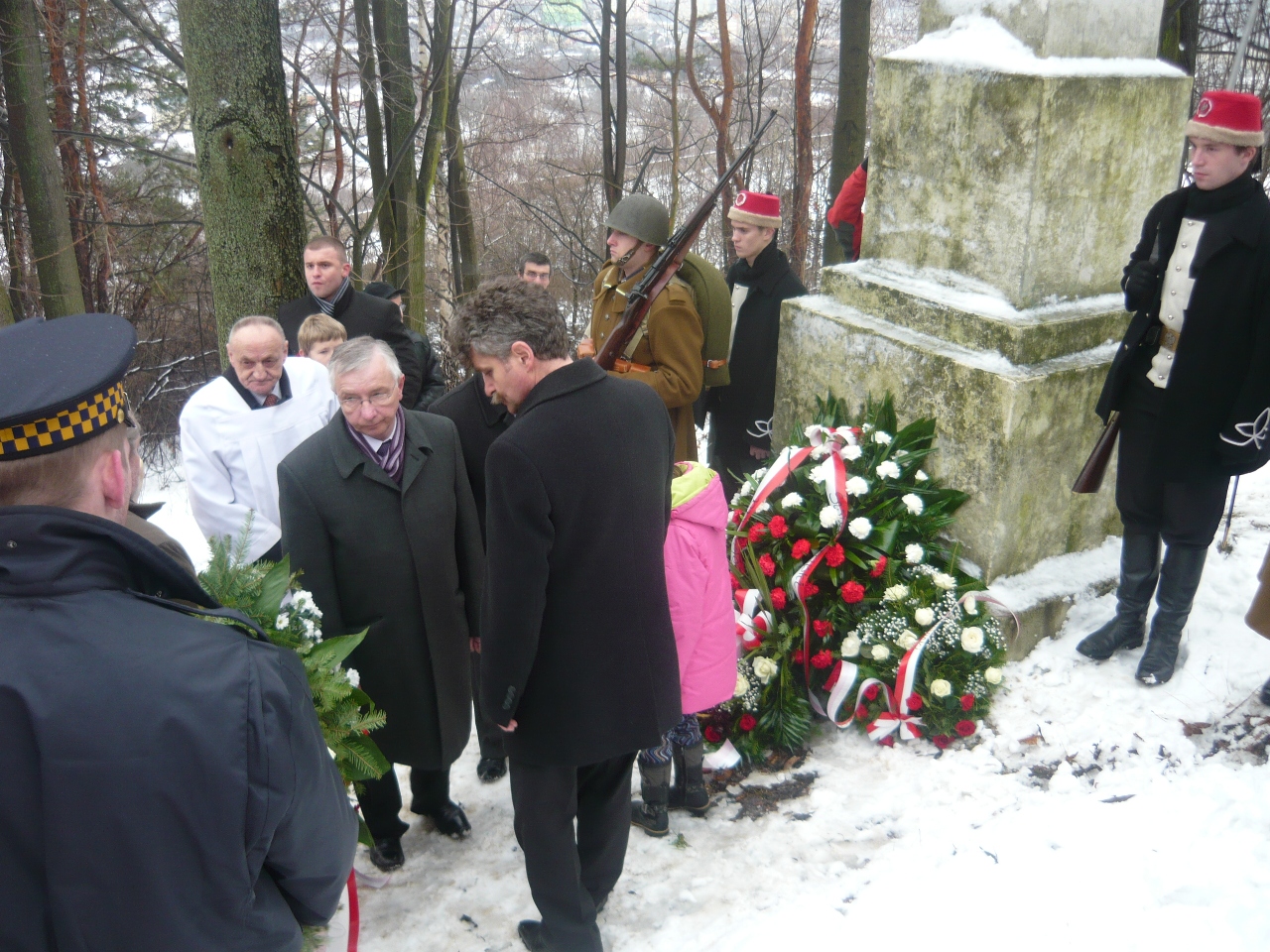 Poseł Krzysztof Lipiec i senator Krzysztof Słoń podczas składania wiązanki kwiatów na mogile powstańców 1863 roku na wzgórzu klasztornym na Karczówce w Kielcach