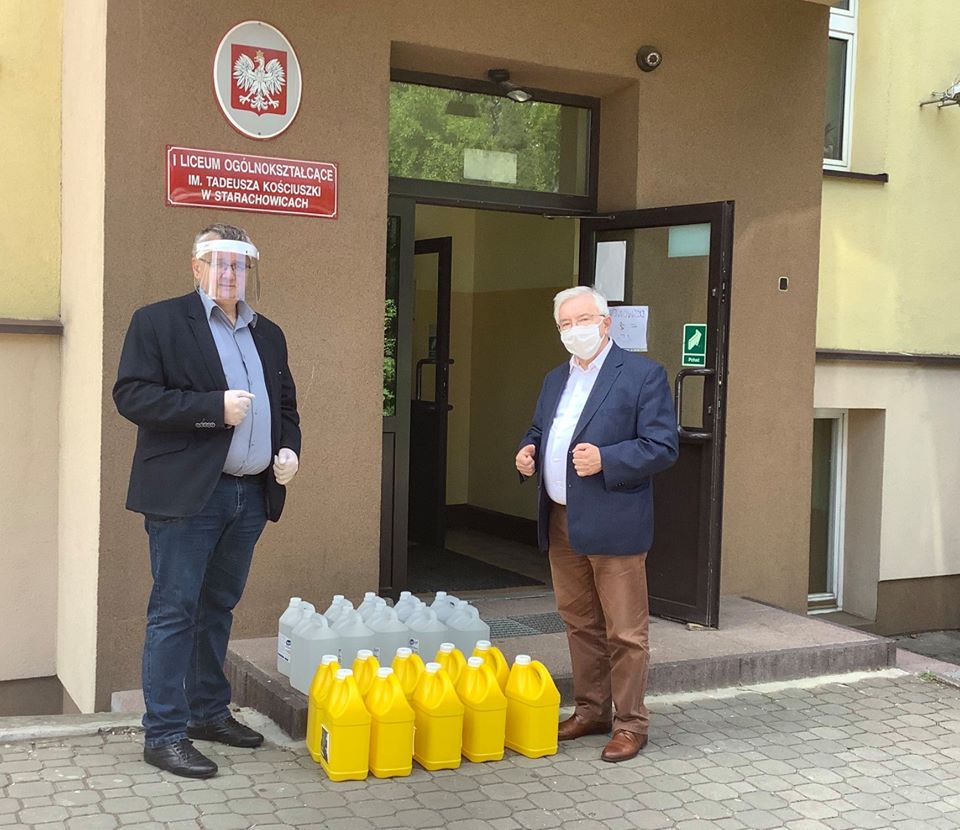 Starachowice. 100 litrów płynu dezynfekującego dla I Liceum Ogólnokształcącego przekazałem dyrektorowi Dariuszowi Lipcowi. Szkoła musi się przygotować do matury. /fb/CHWALCIE ŁĄKI UMAJONE |