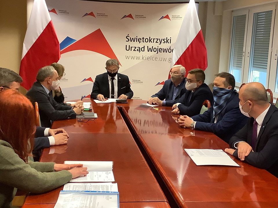 Kielce. Spotkanie z udziałem Wojewody Świętokrzyskiego dr Zbigniewa Koniusza, Starosty Kieleckiego Mirosława Gębskiego Członka Zarządu Powiatu Kieleckiego Mariusza Ściany oraz Dyrektora Regionalnego Ochrony Środowiska i Wojewódzkiego Inspektora Ochrony Środowiska w sprawie skutków pożaru na składowisku odpadów w Nowinach. /fb/11. POSIEDZENIE SEJMU RP - 3 DZIEŃ OBRAD |