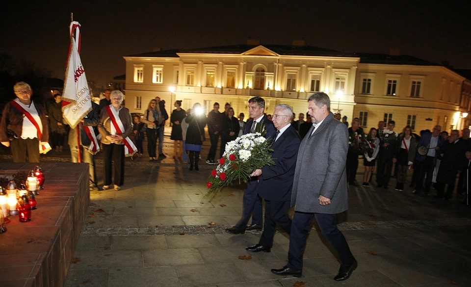 Kielce. Uroczystości ku czci Błogosławionego Księdza Jerzego Popiełuszki w 35. rocznicę męczeńskiej śmierci. Po Mszy Świętej w Bazylice Katedralnej odprawionej przez Księdza Biskupa Mariana Florczyka przed Pomnikiem Błogosławionego Księdza Jerzego złożyliśmy wiązankę kwiatów. 🇵🇱🇵🇱🇵🇱✅Ksiądz Jerzy Popiełuszko patronuje wszystkim tym, którzy życzą sobie dobrych przemian. To była postać, która nawoływała do tego, aby ludzie czynili dobrze. To rzecz niesamowita, bo on był jedynym spośród tych, którzy roztropnie byli zatroskani o dobro wspólne. To on dawał nam nadzieje. Ja też jestem spadkobiercą jego nauczenia, bo w tamtym czasem byłem aktywnym uczestnikiem tego, co „Solidarność” wygenerowała. /fb/