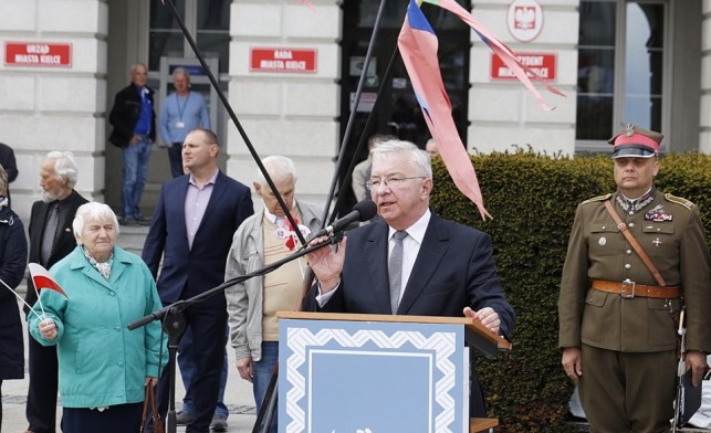Kielce. W dniu narodowego święta Flagi Państwowej uroczyście podniesiono ją kieleckim Rynku. Do zgromadzonych na tej podniosłej uroczystości żołnierzy Wojska Polskiego, przedstawicieli władzy publicznej i mieszkańców Kielc w poselskim przesłaniu mówiłem o doniosłości tego święta króli symboli narodowych jednoczących Polaków i kształtujących naszą narodową tożsamość. Najmłodszym obywatelom naszej Ojczyzny przekazywałem książeczkę „ Kto Ty jesteś - Polak mały”. Towarzyszył mi przewodniczący Sejmiku Andrzej Pruś, który zgromadzonych obdarowywał flagami narodowymi. /fot. TVP3 Kielce i Radio Kielce/ - fb