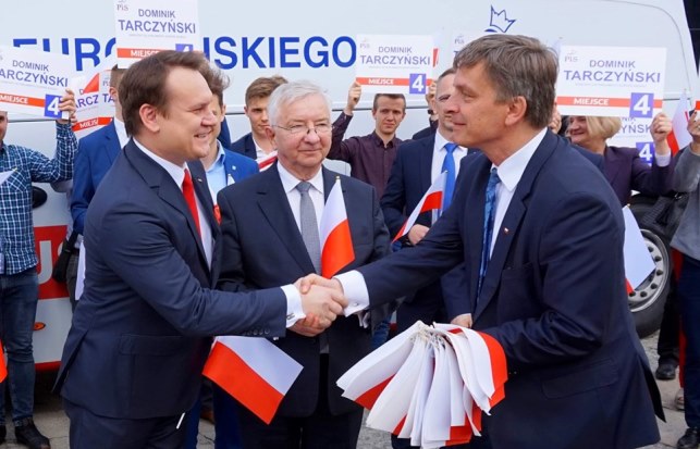 Kielce. Poseł Dominik Tarczyński nasz kandydat do Parlamentu Europejskiego świętował Dzień Flagi Państwowej. Razem ze swoimi sztabowcami w trakcie przemarszu Sienkiewką obdarowywał Kielczan flagami narodowymi. Po briefingu prasowym Tarczybusem wyjechał w kierunku Krakowa. Po drodze będą spotkania z mieszkańcami świętokrzyskiego i małopolski. /fb/