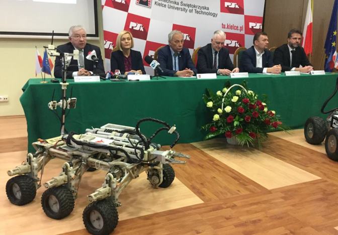 Kielce. Tegoroczna, piąta, edycja European Rover Challenge odbędzie się w Kielcach na Politechnice Świętokrzyskiej, poinformował prezes Europejskiej Fundacji Kosmicznej Łukasz Wilczyński podczas konferencji prasowej na Politechnice Świętokrzyskiej w obecności wicepremiera Jarosława Gowina i rektora uczelni prof. Wiesława Trąmpczyńskiego. Podczas konferencji powiedziałem jak ważną rolę odgrywa Politechnika Świętokrzyska w badaniach naukowych w dziedzinie robotyki kosmicznej. /fb/