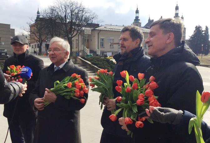 Kielce. Kwiaty z okazji Dnia Kobiet rozdawał dzisiaj paniom na kieleckim placu Artystów poseł Krzysztof Lipiec lider Prawa i Sprawiedliwości w regionie świętokrzyskim. Życzenia i tulipany przekazywali również inni działacze tego ugrupowania: Rafał Nowak, Andrzej Pruś oraz Jarosław Karyś. Krzysztof Lipiec twierdzi, że ludzie prawicy pamiętają o kobietach każdego dnia nie tylko 8 marca. Złożył on jednocześnie, życzenia wszystkim kielczankom i paniom z województwa świętokrzyskiego. Parlamentarzysta dodał, że kobiety od zawsze odgrywały bardzo ważne role w życiu społecznym naszego narodu. Za ich poświęcenie należą im się szczególne podziękowania. /Radio Kielce/ZEBRANIE WIEJSKIE |
