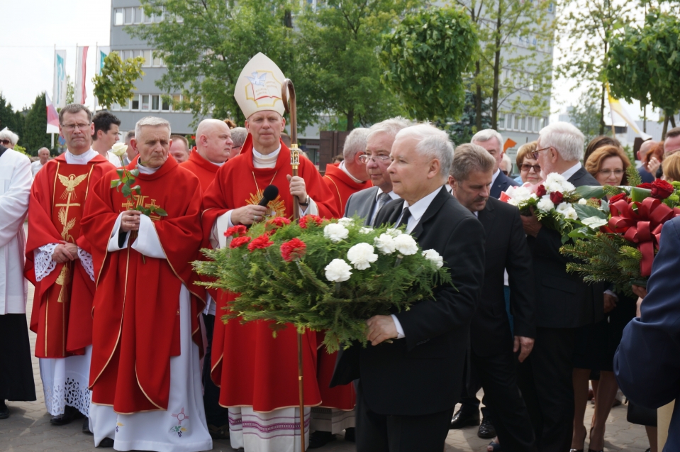 Starachowice. "Ojczyzno moja kochana, umiej być wdzięczna" - te słowa z Dzienniczka świętej Faustyny widnieją na epitafium Prezydenta Lecha Kaczyńskiego w Panteonie Pamięci Narodowej, odsłoniętym w parafii Wszystkich Świętych w Starachowicach. Panteon jest miejscem poświęconym pamięci wielu znanych Polaków i bohaterów, wśród nich także starachowiczan. W dzisiejszych uroczystościach uczestniczył prezes Prawa i Sprawiedliwości Jarosław Kaczyński. Dziękując za Panteon, wspominając swoją mamę - Jadwigę Kaczyńską, która uczestniczyła w życiu kościoła Wszystkich Świętych, i wyrażając nadzieję, że kościół ten będzie nadal ważnym miejscem nie tylko na religijnej, ale też na społecznej mapie Starachowic, Jarosław Kaczyński mówił o roli Kościoła: - To jest taka specyficzna cecha naszego życia społecznego, naszego życia narodowego. Są tacy, którzy z tego powodu bardzo boleją, ale ja jestem przeświadczony, że to jest jeden z fundamentów naszej tożsamości, naszego sposobu życia, że to jest jeden z fundamentów Polskości. Poseł Krzysztof Lipiec powiedział podczas uroczystości odsłonięcia Panteonu, że na pamiątkowych tablicach zapisane są życiorysy skromnych ludzi, którzy całym sercem służyli ojczyźnie. Wyraził także wdzięczność wszystkim osobom, dzięki którym to niezwykłe miejsce pamięci powstało. -" To dla nas starachowiczan wielka radość, że na 80-lecie parafii Wszystkich Świętych mogliśmy poświęcić nowy Panteon Pamięci Narodowej. Środowiska patriotyczne są bardzo związane z tą parafią. Tu u boku księży dziekanów zawsze mogliśmy wspominać ważne wydarzenia z historii naszej ojczyzny i jej bohaterów - powiedział Krzysztof Lipiec. /Radio Kielce/