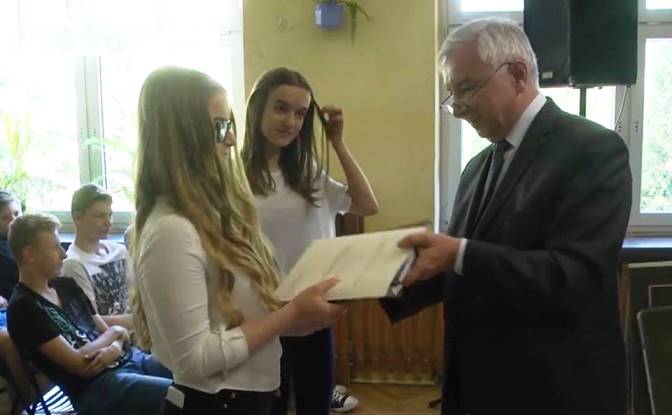 Starachowice. Z gratulacjami dla Zuzanny Krzemińskiej i Julii Wysockiej, uczennic Gimnazjum nr 3 w Starachowicach, które zdobyły mandaty poselskie na XXIII sesję Sejmu Dzieci i Młodzieży. /fb/