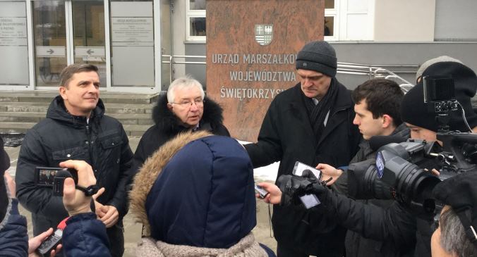 Kielce. Briefing prasowy przed Urzędem Marszałkowskim. Adam Jarubas został ponownie wezwany do ujawnienia nazwisk polityków lobbujących na rzecz prywatnych podmiotów co miałoby stanowić szkodę dla publicznego interesu. /fb/PROMUJEMY CENTRALNY OKRĘG PRZEMYSŁOWY |