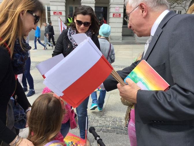 Kielce. Obchody Dnia Flagi na kieleckim Rynku. Milusińskich obdarowywałem książeczkami "Kto Ty jesteś", a dorosłych chorągiewkami w narodowych barwach. /fb/NA ANTENIE RADIA KIELCE |