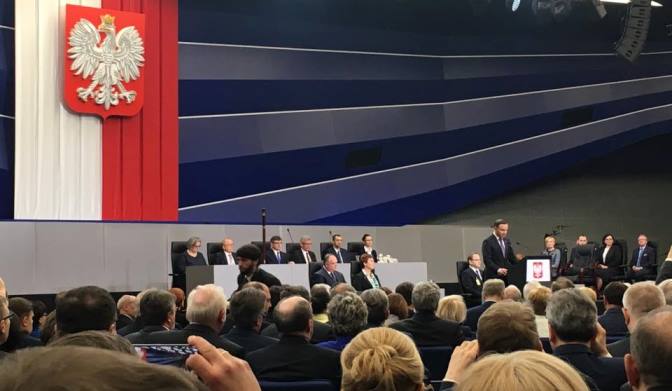 Poznań. Dla uczczenia jubileuszu 1050-lecia chrztu Polski i początków Państwa Polskiego, na terenie Międzynarodowych Targów Poznańskich, odbyło się uroczyste Zgromadzenie Narodowe. Podczas tego wyjątkowego posiedzenia Sejmu i Senatu, organizowanego po raz pierwszy w historii poza Warszawą, orędzie wygłosił prezydent RP Andrzej Duda. Obradom przewodniczyli marszałkowie Sejmu i Senatu: Marek Kuchciński i Stanisław Karczewski. /fb/