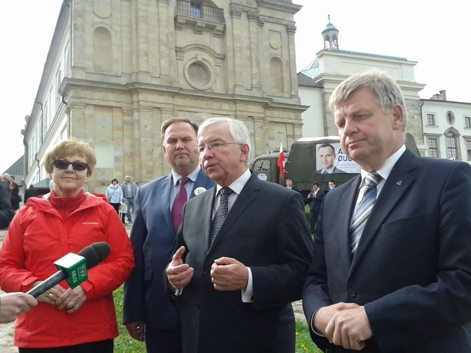 Św. Krzyż. Przed rozpoczęciem Wielkiej Majówki Świętokrzyskiego PiSu wraz z parlamentarzystami spotkałem się podczas briefingu prasowego z dziennikarzami. Mówiłem o naszej dzisiejszej akcji przeprwadzonej na terenie województwa świętokrzyskiego, podczas której rozdaliśmy blisko 100 tys. przygotowanej przez Świętokrzyski Sztab Wyborczy Andrzeja Dudy gazet. "Dzisiaj w kampanii wyborczej, zatrzymujemy się tu na Świętym Krzyżu, aby w modlitwie powierzyć Bogu naszą Ojczyznę, aby Polacy postawili na dobrego Prezydenta, który przywróci wiarę w to, że Polska jest Ojczyznę wszystkich Polaków, Tych którym się powiodło i Tych, którzy nie potrafili odnaleźć się w nowej rzeczywistości. Dlatego jak nakazuje polska tradycja spotykamy się na Majówce" - powiedziałem min. do dziennikarzy. /fb/DLA POLSKI ANDRZEJ DUDA |