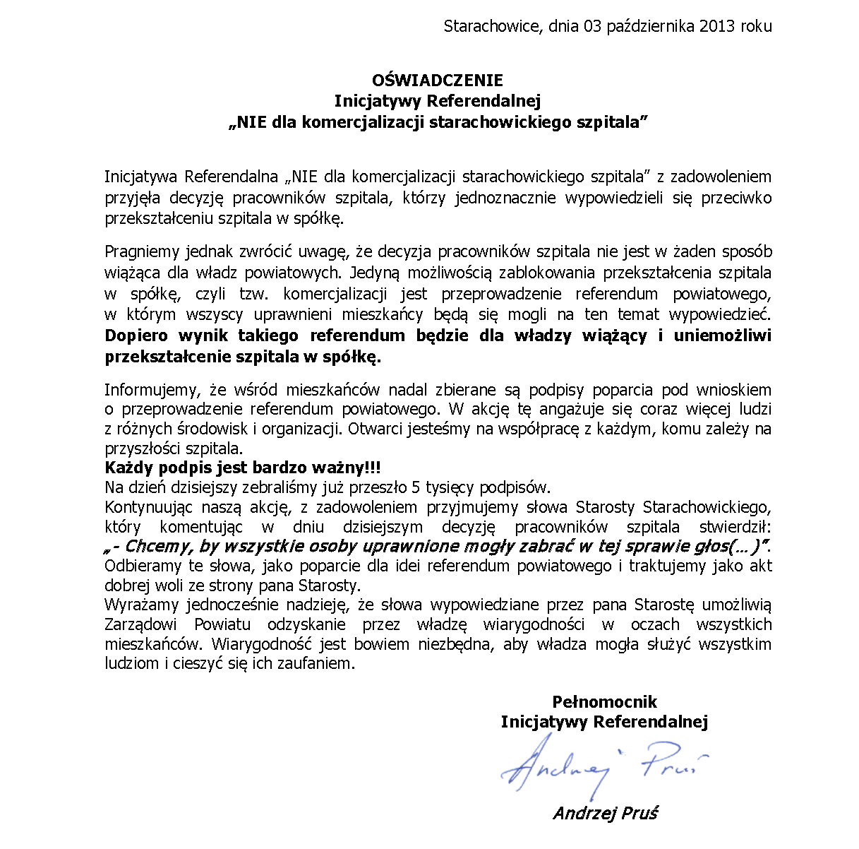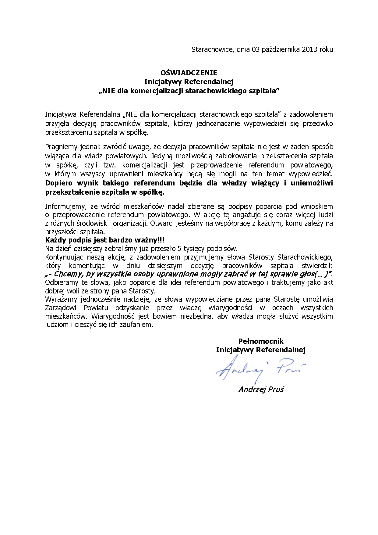 Krynki. Radni z Dziurowa, Krynek, Lubieni i Stawu Kunowskiego zbierali podpisy w Krynkach w sprawie referendum " Nie dla komercjalizacji szpitala". Mieszkańcy licznie poparli tę akcję.Podpisy zbierano też w wielu innych miejscowościach powiatu starachowickiego. Podczas niedzielnej akcji zebrano ponad 2000 podpisów - poinformował Andrzej Pruś pełnomocnik Inicjatywy Referendalnej " Nie dla komercjalizacji szpitala".