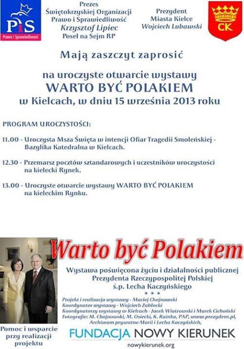 Skarżysko Kamienna. W Sanktuarium Matki Bożej Ostrobramskiej odbył się wernisaż wystawy poświęconej życiu i działalności publicznej śp. Prezydenta RP Lecha Kaczyńskiego "Warto być Polakiem". Wernisaż ten zainicjował prezes świętokrzyskiego Prawa i Sprawiedliwości poseł Krzysztof Lipiec wraz ze starostą skarżyskim Michałem Jędrysem. W uroczystości tej uczestniczyli posłowie Maria Zuba i Jarosław Rusiecki oraz prezydent Skarżyska Roman Wojcieszek. Andrzej Pruś sekretarz świętokrzyskiego PiS odczytał okolicznościowy list premiera Jarosława Kaczyńskiego prezesa Prawa i Sprawiedliwości.POLSKA WIEŚ SZANSĄ POLSKI |