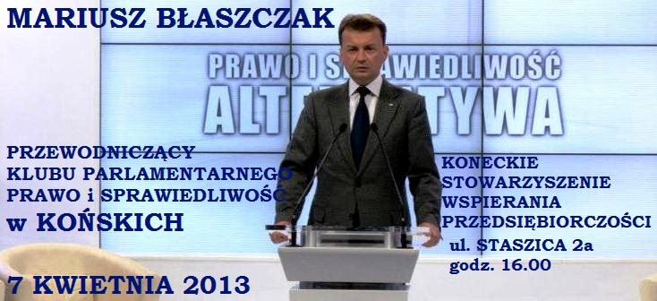 Końskie. Przewodniczący Klubu Parlamentarnego Prawo i Sprawiedliwość Mariusz Błaszczak spotkał się z mieszkańcami Końskich w ramach ogólnopolskiej debaty kierownictwa partii z mieszkańcami powiatów. W spotkaniu uczestniczyli świętokrzyscy parlamentarzyści na czele z prezesem partii w regionie posłem Krzysztofem Lipcem. Gospodarzem spotkania był Andrzej Lenart wicestarosta konecki.