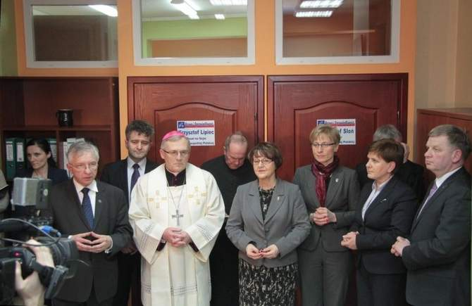 Kielce. Przy udziale świętokrzyskich parlamentarzystów Prawa i Sprawiedliwości ks. bp Kazimierz Gurda poświęcił nowy lokal Biura Poselsko - Senatorskiego oraz Świętokrzyskiej Organizacji Prawa i Sprawiedliwości. Wiceprezes partii pani poseł Beata Szydło dokonała uroczystego otwarcia biur. Kieleckie biuro parlamentarne utworzyli posłowie Krzysztof Lipiec, Maria Zuba, Jarosław Rusiecki oraz senatorowie Krzysztof Słoń i Mieczysław Gil. Po uroczystości odbył się briefing prasowy pani prezes Beaty Szydło./fot. Echo Dnia/