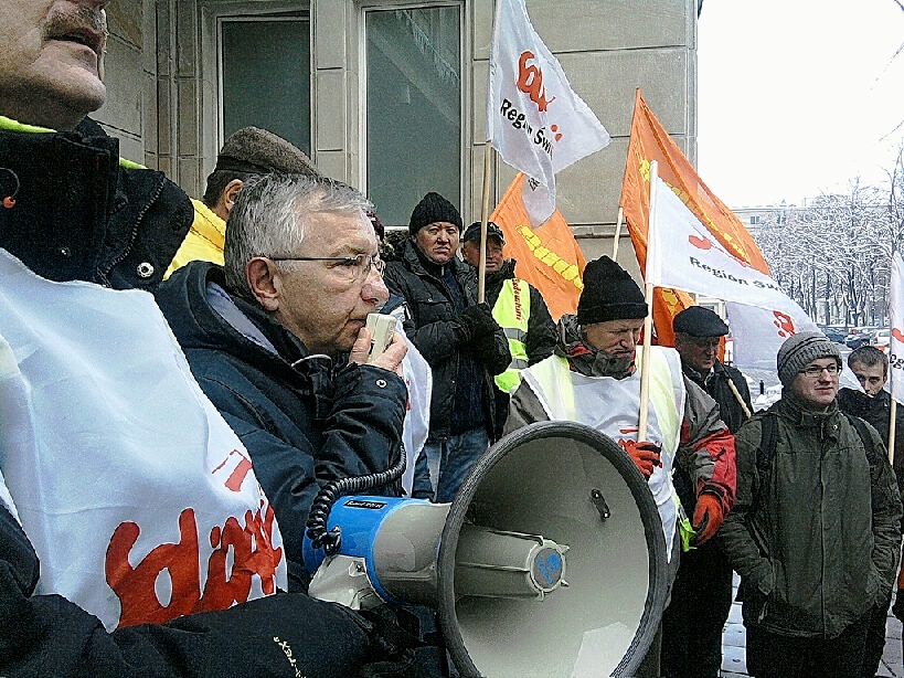 Warszawa. Załoga Kieleckich Kopalni Surowców Mineralnych protestowała przed Ministerstwem Skarbu Państwa wobec podjętej w 2011 roku decyzji o prywatyzacji doskonale prosperującej firmy, która w niecały rok po prywatyzacji stała się bankrutem. Dzisiaj Kieleckie Kopalnie są w upadłości układowej. Skarb Państwa zalega firmie 63 mln zł z tytułu dostaw kruszywa na budowę autostrad. Do protestujących przybył z poparciem poseł Krzysztof Lipiec wraz z posłami Marią Zubą i Jarosławem Rusieckim.