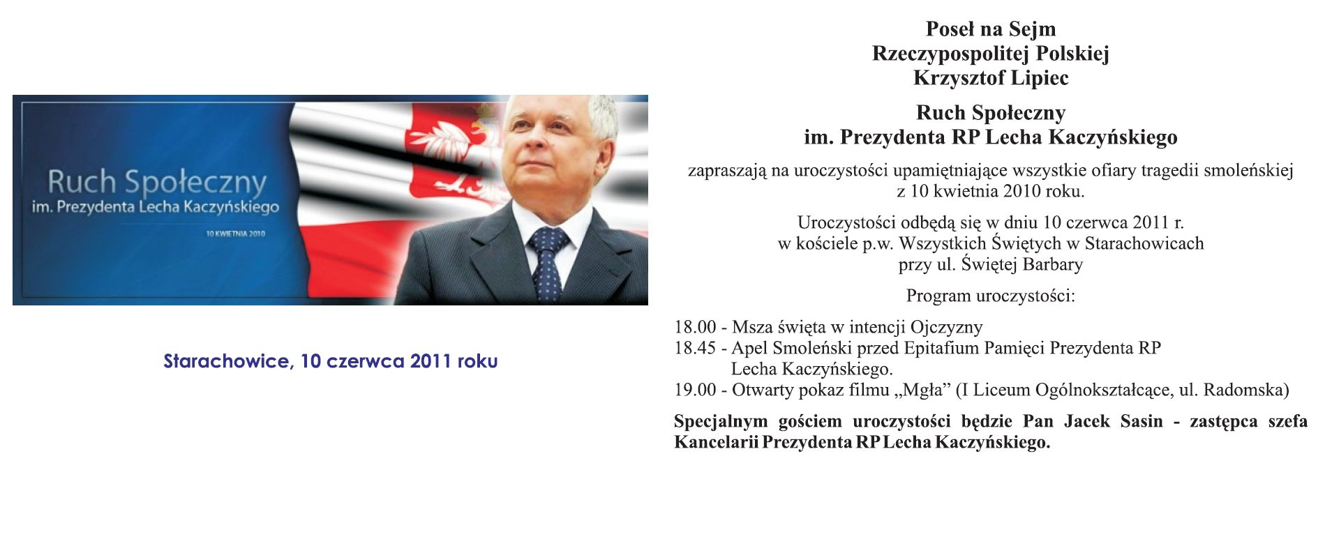| Warszawa. W czternaście miesięcy po Tragedii Smoleńskiej parlamentarzyści Prawa i Sprawiedliwości na czele z Jarosławem Kaczyńskim oddali hołd tym, którzy zgineli w katastrofie lotniczej w drodze na Katyński Cmentarz Wojenny, gdzie spoczywają Polacy zamordowani przez swoieckich Rosjan. W kościele seminaryjnym została odprawina Msza Święta, a po niej przed Pałacem Prezydenckim został złożony wieniec. Na Cmentarzu Powązkowskim na gobach smoleńskich złożono kwiaty i zapalono znicze. Poseł Krzysztof Lipiec uczestniczył w tych uroczystościach. |
