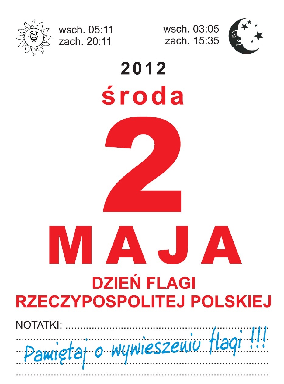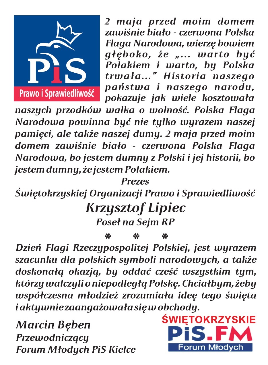 Kielce, Starachowice. Młodzież skupiona wokół Forum Młodych Prawo i Sprawiedliwość prowadzi na terenie Kielc i Strachowic akcję przypominającą mieszkańcom naszego regionu o przypadającym w dniu 2 maja Święcie Flagi Narodowej. Podczas akcji młodzi ludzie rozdają przygotowane specjalnie z tej okazji pocztówki przypominające o kieczności wywieszenia 2 maja Polskiej Flagi Narodowej. Już w pierwszych godzinach akcji prowadzonej przez Forum Młodych Prawo i Sprawiedliwość, młodzi ludzie zaangażowani jej prowadzenie mogli się przekonać o wielkiej życzliwości, z jaką mieszkańcy Kielc i Starachowic reagowali na tak niecodzienne wydarzenie.Okolicznościowa pocztówka przypominająca o Dniu Flagi Narodowej