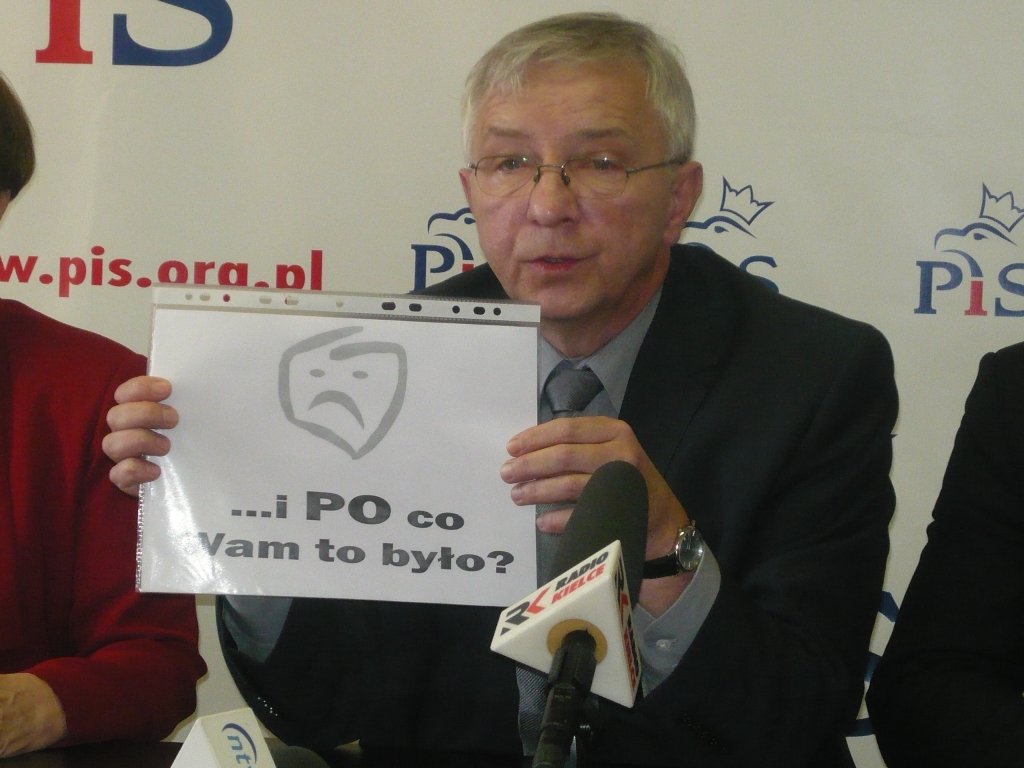 Kielce. Podczas konferencji prasowej, która odbyła się w kieleckim Biurze Poselsko - Senatoeskim PiS, Prezes Świętokrzyskiej Organizacji Prawo i Sprawiedliwość, Posełna Sejm RP Krzysztof Lipiec poinformował dziennikarzy o nowej, spektakularnej akcji świętokrzyskiego PiS, która zastała nazwana "...i PO co Wam to było?". Głównym celem akcji będzie organizacja cyklu publicznych spotkań dla zwolenników i wyborców Platformy Obywatelskiej, którzy - jak stwierdził podczas konferencji poseł Krzysztof Lipiec - "...czują się dziś oszukani przez Donalda Tuska i Platformę Obywatelską". Pierwsze z cyklu takich spotkań odbędzie się już w sobotę 1 grudnia na Placu Artystów w Kielcach. W konferencji prasowej wraz z posłem Krzysztofem Lipcem wzięli także udział: posłowie Maria Zuba i Jarosław Rusiecki oraz Senator Krzysztof Słoń.