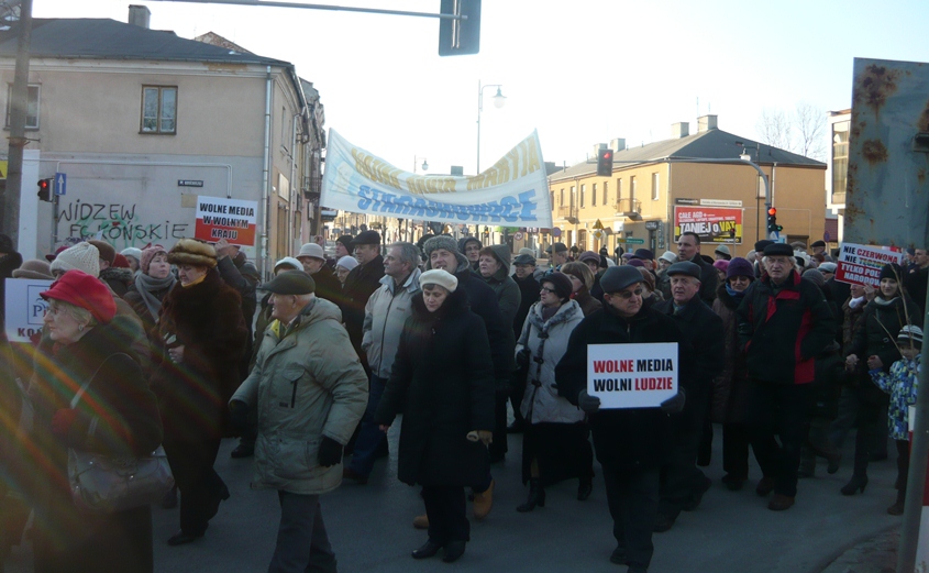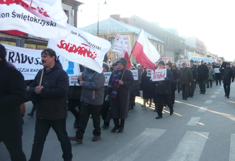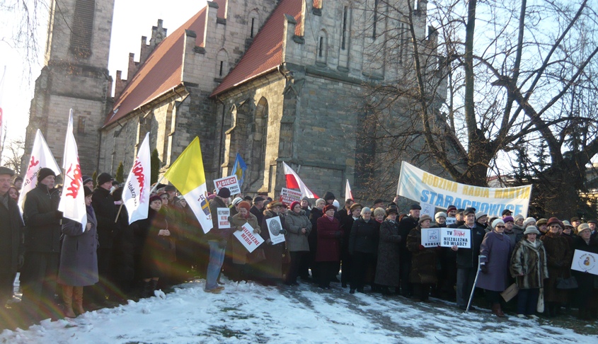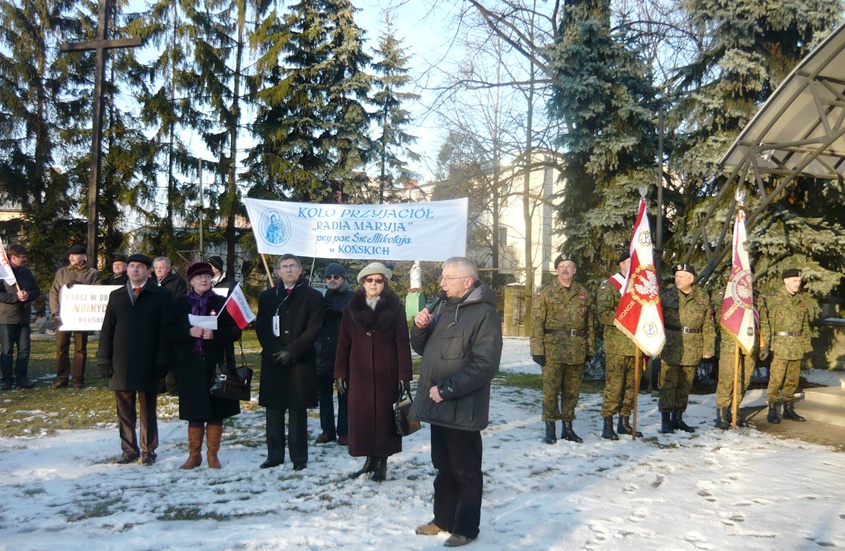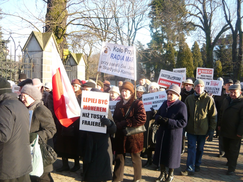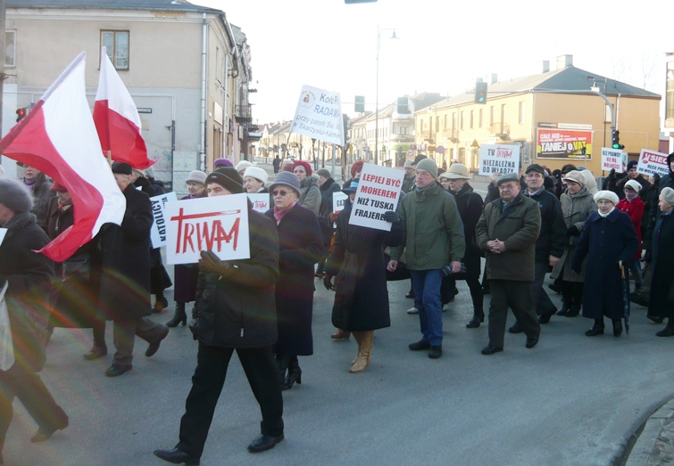 Końskie. Mieszkańcy powiatu koneckiego udzielili poparcia dla Telewizji TRWAM, której władze nie chcą przyznać miejsca na cyfrowym multipleksie. Po Mszy Św. sprawowanej w kościele Św. Mikołaja w intencji Radia Maryja i wszystkich dzieł przy nim powstałych ulicami miasta przeszedł Marsz w obronie wolnych mediów i Telewizji TRWAM. W marszu uczestniczyli posłowie Prawa i Sprawiedliwości Krzysztof Lipiec i Maria Zuba oraz wicestarosta konecki Andrzej Lenart. Marsz zorganizowało koneckie Prawo i Sprawiedliwość i konecka Rodzina Radia Maryja. Wzięli w nim udział liczne środowiska min. kombatanci, Solidarność i Strzelcy. Poseł Krzysztof Lipiec wyraził wdzięczność wszystkim uczestnikom marszu za dane świadectwo przywiązania do prawdy i wolności. "To już dziewiąty marsz, który kroczy przez świętokrzyską ziemię. Dzisiaj Konecczyzna wyraża swój sprzeciw wobec dyskryminacji Telwizji TRWAM i wolnych mediów. Nie damy sobie wmówić, że wolność mediów polega na głoszeniu jedynie słusznych poglądów zgodnych z linią rządzącej partii. To fałsz i zakłamanie. Mniejszość nie może narzucić swej woli większości. I to nie tylko w kwestii wolności mediów, ale także w sprawach moralności publicznej. Dzisiaj rządzący miast zajmować się ważnymi ludzkim sprawami, jak chociażby zwalczaniem bezrobocia uznali, że dobrobyt społeczny można zapewnić legalizując tzw. związki homoseksualne. Musimy dać temu odpór. I mając w pamięci postawę naszych ojców, którzy walcząc o wolną Polskę na sztandar mieli wypisane Bóg, Honor, Ojczyzna. Nie lękajcie się - warto dzisiaj przypomnieć słowa naszego Rodaka błogosławionego Jana Pawła II" - powiedział min. parlamentarzysta. Do zebranych swoje przesłanie skierowała również pani Krystyna Dulewicz z koneckiej Rodziny Radia Maryja.