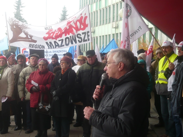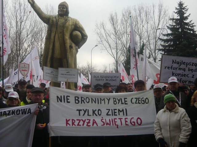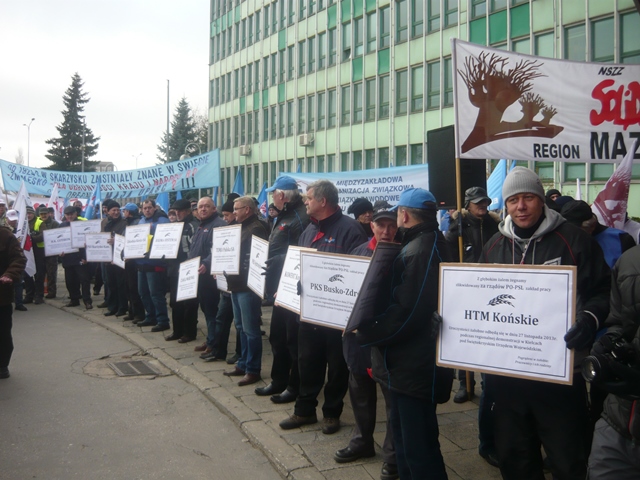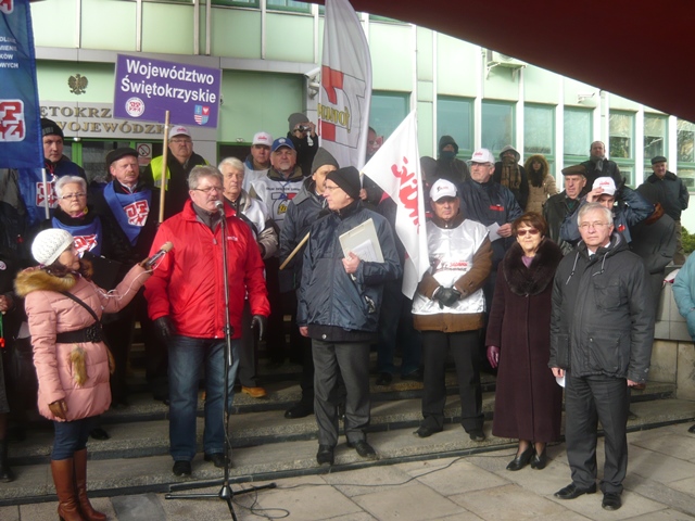 Kielce. Przed Świętokrzyskim Urzędem Wojewódzkim odbyła się antyrządowa manifestacja związków zawodowych w obronie praw pracowniczych. Solidarność, OPZZ i Forum Związków Zawodowych ze swoim regionalnymi liderami zgromadzili się wokół pomnika "Złotego Donka", aby zdać relacje z życia na Zielonej Wyspie. U stóp pomnika związkowcy złożyli nekrologi upadłych świętokrzyskich firm za czasów rządów PO - PSL i zawiesili czerwone kartki z wypisanymi przewinieniami rządu wymierzonymi w świat pracy. Do protestujących przybyli posłowie Prawa i Sprawiedliwości Krzysztof Lipiec i Maria Zuba wraz z sekretarzem świętokrzyskiego PiS Andrzejem Prusiem. Poseł Krzysztof Lipiec wyraził wdzięczność protestującym za zdecydowaną postawę wobec polityki rządu, określając ją jako antypolską, bo jest wymierzona przeciwko ludziom polskiego świata pracy. "Ta antyrządowa manifestacja jest poparciem dla programu Prawa i Sprawiedliwości. Bądźmy razem, razem zmieniajmy Polskę. Niech ten sierpniowy "wiatr od morza" zdmuchnie tych co szkodzą Polsce. Nasza nadzieja w Solidarności" - powiedział m.in. poseł Krzysztof Lipiec.