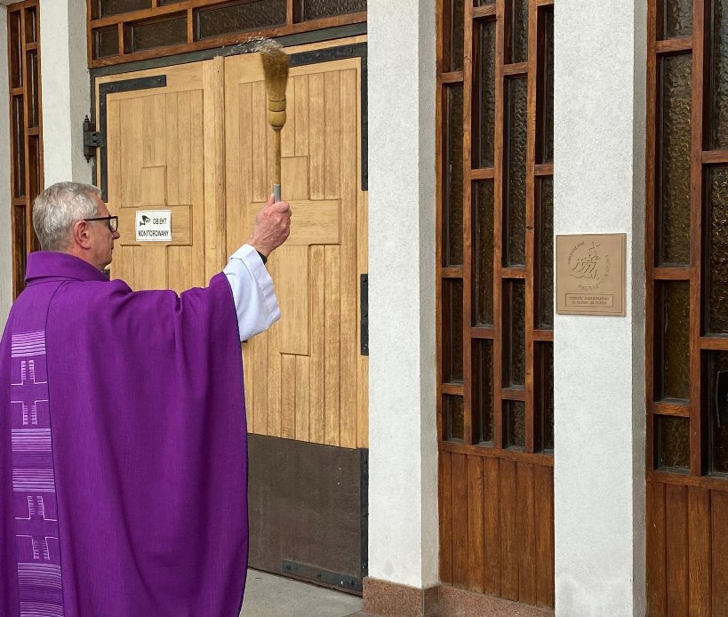 Starachowice. Ks. Dziekan Sławomir Rak - poświęcił tablicę upamiętniającą ustanowienia Świątyni pw. Wszystkich Świętych Kościołem Jubileuszowym. Fundatorem tablicy jest starachowicka Firma SIGMATECH. /fb/