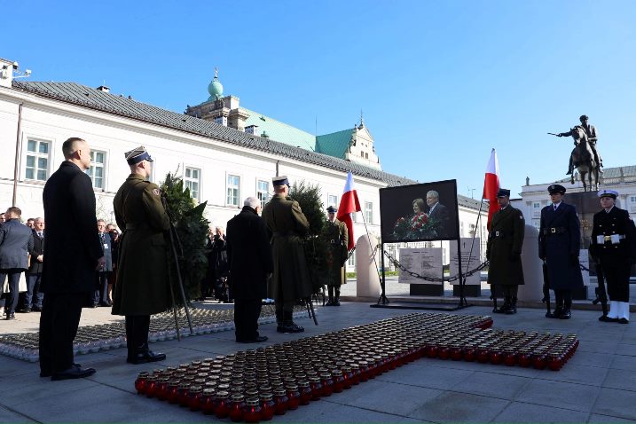 Warszawa. W XVI rocznicę Katastrofy Smoleńskiej Prezes PiS Jarosław Kaczyński, Prezydent RP Karol Nawrocki oraz Przedstawiciele Prawa i Sprawiedliwości oddali hołd i złożyli kwiaty przed Pałacem Prezydenckim, pod Pomnikiem upamiętniającym Śp. Prezydenta RP Lecha Kaczyńskiego oraz pod Pomnikiem Ofiar Tragedii Smoleńskiej 2010 roku. #Pamiętamy 🕯️ /fb/