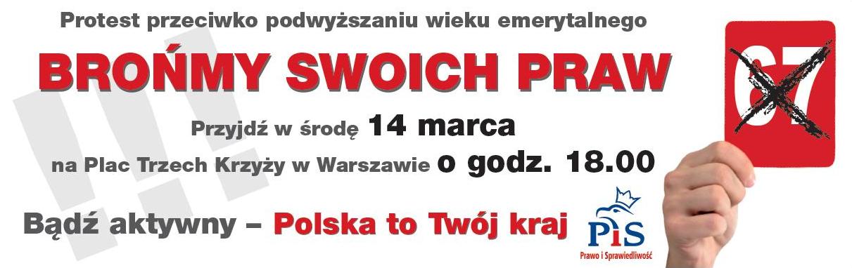 Od odśpiewania hymnu na pl. Trzech Krzyży w Warszawie rozpoczęła się manifestacja przeciwko podwyższaniu wieku emerytalnego. Jarosław Kaczyński jako wyraz sprzeciwu wobec prowadzonej przez Donalda Tuska polityki pokazał rządowi czerwoną kartkę. „Chcemy ją pokazać, bo naprawdę dosyć tego” – podkreślił. W manifestacji uczestniczyło wiele tysięcy Polaków. „Polacy zostali oszukani. My będziemy protestować przeciw tej tzw. reformie i innym wydarzeniom, które mają miejsce w naszym kraju” – powiedział Prezes PiS. „Będziemy protestowali przeciw temu, żeby władza oszukiwała obywateli” – zaznaczył. „Trzeba chcieć, trzeba mieć władzę, która nie jest zależna od możnych, władzę uczciwą, patriotyczną” – mówił. Manifestujący ruszyli w stronę Kancelarii Prezesa Rady Ministrów, śpiewając pieśń Jana Pietrzaka „Żeby Polska była Polską”. Trzymali biało czerwone flagi i transparenty m.in. z hasłami „Brońmy swoich praw”, „Ręce precz od emerytur”, „Władza wasza, bieda nasza”, „Dość Tuska miłości, chcemy godnej starości”. Pod budynkiem Kancelarii Premiera wznieśli w górę czerwone kartki jako wyraz protestu wobec rządu Tuska. Wtedy głos zabrał ponownie Jarosław Kaczyński. Prezes PiS podziękował zebranym za przybycie. „Jeśli chcemy walczyć o swoje prawa, musimy demonstrować” – podkreślił. „Polskie społeczeństwo ma dzisiaj płacić rachunek za kilka lat skrajnie nieudolnych rządów” – powiedział. Jarosław Kaczyński przywołał prawidłowość, która jego zdaniem dobrze charakteryzuje rządy Tuska. „Jest zasada bardzo wyraźna i nikczemna: czym ktoś słabszy, tym ma więcej płacić” – powiedział. „Uderzono w najsłabszych, w tych, którzy nie mogą się bronić” – powiedział. „Liczono na to, że solidarność w Polsce została zapomniana” – zaznaczył. „Dzisiaj mówimy Tuskowi: nie została zapomniana. Jeśli nie wierzy, niech wyjrzy przez okno”- mówił, wskazując na okno budynku Kancelarii Prezesa Rady Ministrów. Jak zapewnił, Prawo i Sprawiedliwość będzie bronić „słabszych, chorych, emerytów (…) uczniów, polskiej rodziny, polskich samorządów (…) – wyliczał. „Będziemy bronić inwestycji, na które były pieniądze, a teraz tych pieniędzy nie ma” – podkreślił. „Wczoraj mogłem zobaczyć papiery, które pokazują kolejny fakt. Ci, którzy dokonali likwidacji Stoczni Gdyńskiej mają na tym zarobić po 11 milionów złotych - powiedział. „To wystarczy dla kilkudziesięciu pracowników na całą ich drogę zawodową” – dodał.„Otrzymują i zyskują ci, którzy niszczą, a nie ci którzy budują” – stwierdził. Wokół rozległy się okrzyki: „Złodzieje, złodzieje”. „W naszym społeczeństwie jest ogromny potencjał inwencji, pracowitości. Moglibyśmy iść do góry jak rakieta, a idziemy z ogromnym bólem” – podkreślał Jarosław Kaczyński. „Rządzą ci, którym trzeba pokazać czerwoną kartkę. Dosyć tego” – wzywał Prezes PiS. „Za to, że nie szanują Polaków, nie szanują Polski i siebie nie szanują. Smoleńsk jest tego najlepszym przykładem” – powiedział. Zebrani odpowiedzieli okrzykami „Chcemy prawdy o Smoleńsku”. „Póki jest tutaj ten premier i jego kompania, póty prawdy się nie dowiemy. Potrzebujemy w Polsce nowej władzy i będziemy ją mieli!” – podsumował Jarosław Kaczyński. Na zakończenie manifestujący odśpiewali hymn narodowy.
