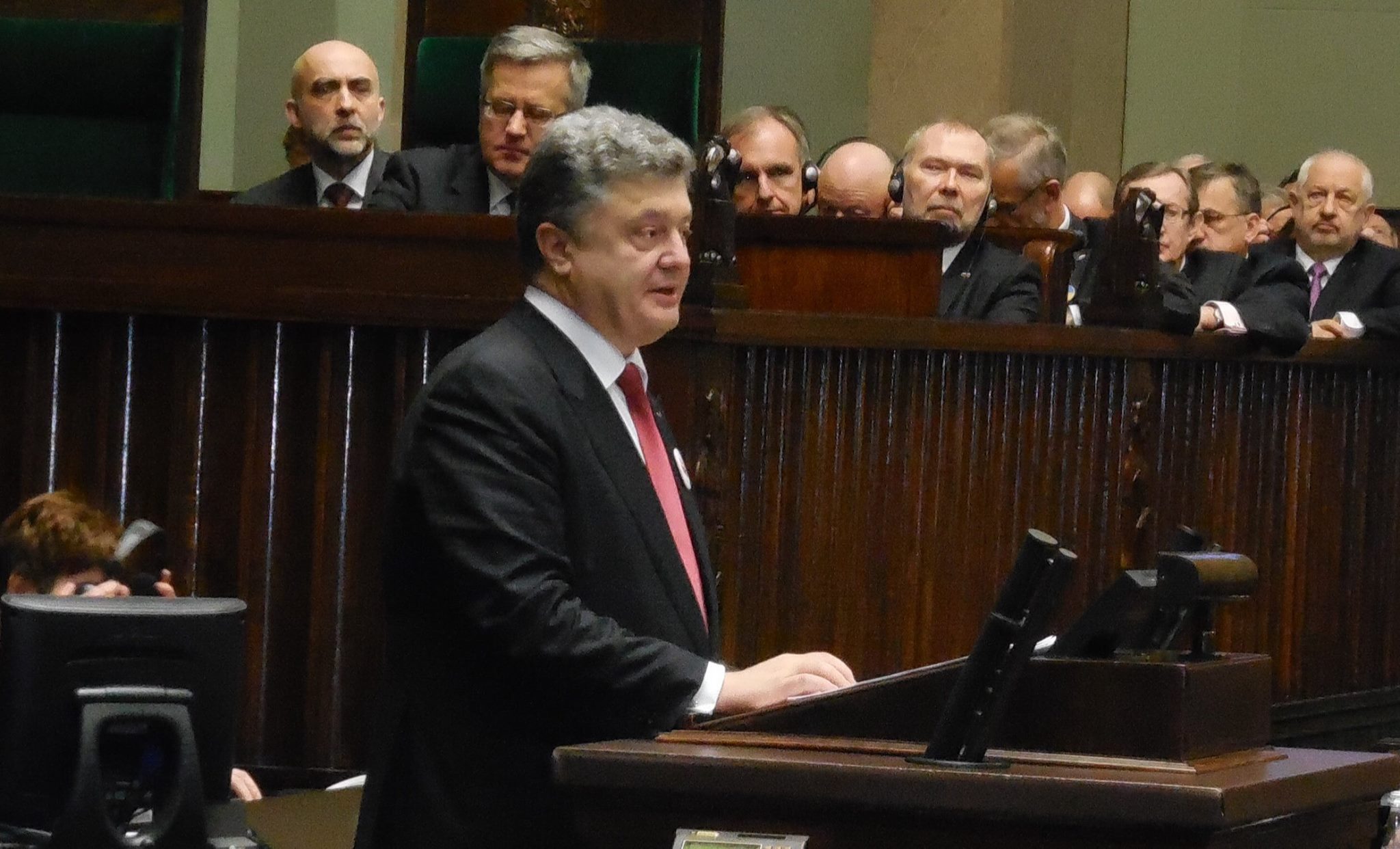 Sejm RP. Prezydent Ukrainy Petro Poroszenko w polskim Sejmie wygłosił przemówienie przed Zgromadzeniem Narodowym. Te ważne słowa skierowane były do Narodu Polskiego. Prezydent Ukrainy wyraził wdzięczność Polakom za wspieranie ukraińskich dążności do niepodległości i wolności. Dziękował za wspieranie ukraińskich starań akcesyjnych z Unią Europejską. "Polacy wyciągnęli do nas braterską rękę, gdy wróg przekroczył próg naszego domu. O Waszej pomocy Ukraińcy nigdy nie zapomną"- powiedział prezydent Ukrainy Petro Poroszenko na uroczystym zgromadzeniu posłów i senatorów w Sejmie. /fb/82. POSIEDZENIE SEJMU RP |