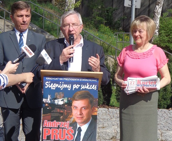 Starachowice. Kampania wyborcza kandydata Prawa i Sprawiedliwości Andrzeja Prusia wychodzi na ostatnią prostą przed niedzielnymi wyborami. Na skwerku imienia Zdzisława Rachtana "Halnego” obok fontanny odbyła się konferencja prasowa w której udział wzięli poseł Krzysztof Lipiec, Andrzej Pruś kandydat na prezydenta Starachowic, przewodnicząca Rady Miejskiej Lidia Dziura i radna Joanna Główka. "Krążymy po ulicach Starachowic od miesiąca, jesteśmy jednym z najbardziej skutecznych komitetów, prowadzimy rozmowy z mieszkańcami miasta i słuchamy ich głosu" – mówił m.in. poseł Krzysztof Lipiec. "Ja przystępuję do tej kampanii z wiarą. Mocno wierzę, że na czele władzy samorządowej w Starachowicach stanie Andrzej Pruś. Ludziom brakuje kogoś, kto by ich wysłuchał i poważnie potraktował ich pomysły. Ja w ciągu trzech tygodni kampanii słucham ludzi i obiecuję, że kiedy zostanę prezydentem będę kontynuował cykl spotkań z mieszkańcami" - mówił m.in. Andrzej Pruś.STARACHOWICKI KURIER WYBORCZY |