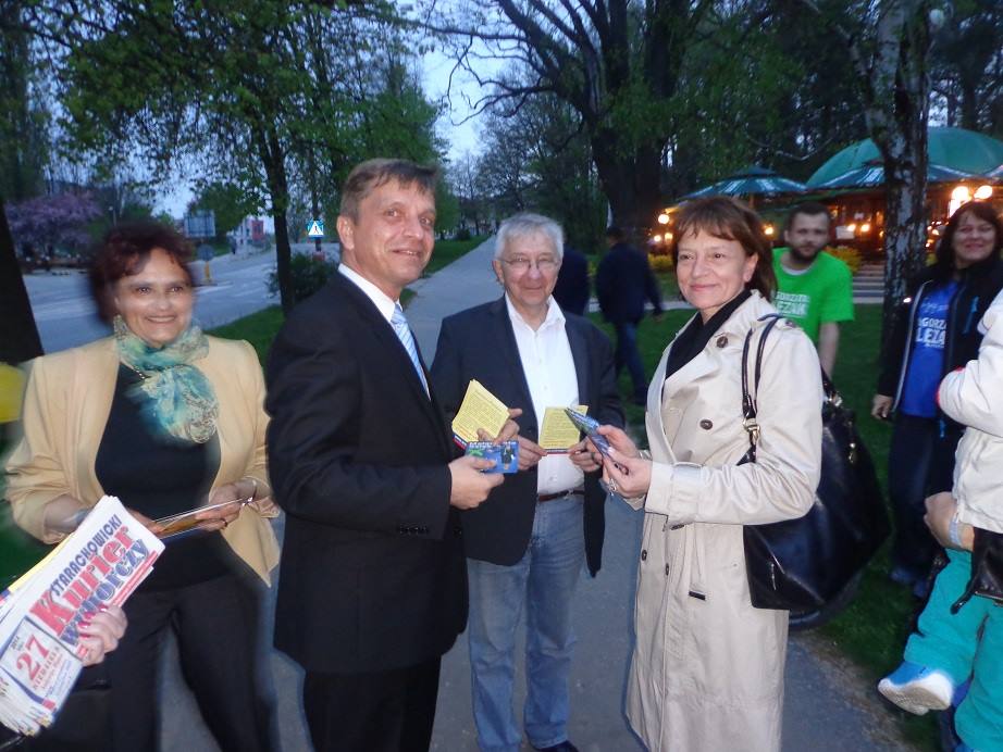 Starachowice. Andrzej Pruś sięga po sukces w ostatnim dniu kampanii przed wyborami prezydenckimi. Jak co dzień spotykał się z mieszkańcami i niespodziewanie z kontrkandydatką Małgorzatą Szlęzak. W miłej atmosferze wymienili swoje ulotki. Andrzej Pruś wyraził żal, że pani Małgorzata nie może oddać na niego głosu, ponieważ nie jest mieszkanką Starachowic. Andrzejowi Prusiowi towarzyszył poseł Krzysztof Lipiec i radni PiS na czele z przewodniczącą Rady Miejskiej Lidią Dziurą.ANDRZEJ PRUŚ Z POPARCIEM EUROPOSŁA |