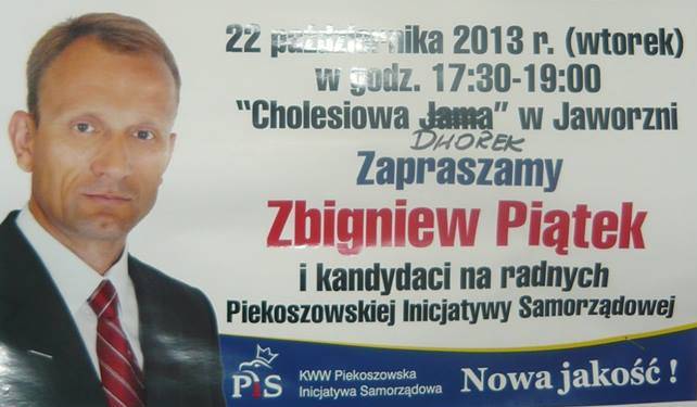Jaworznia. Poseł Krzysztof Lipiec spotkał się z kandydatami na radnych Piekoszowskiej Inicjatywy Samorządowej /PIS/. W dniu dzisiejszym pełnomocnik KWW PIS Dariusz Zych zarejestrował w Gminnej Komisji Wyborczej 11 kandydatów na radnych w przedterminowych wyborach wyznaczonych na 10 listopada 2013 roku. Kandydaci na radnych otrzymali poparcie Prawa i Sprawiedliwości. Był również Zbigniew Piątek kandydat na wójta gminy Piekoszów. W spotkaniu uczestniczyli również pani poseł Maria Zuba i Andrzej Pruś sekretarz świętokrzyskiego Prawa i Sprawiedliwości.APEL SMOLEŃSKI W STARACHOWICACH |